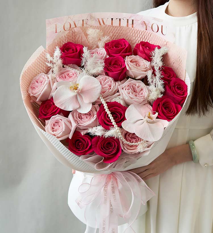 弗洛伊德玫瑰11枝,粉色荔枝玫瑰8枝,白色蝴蝶兰2朵喷淡粉色,白色蓬莱松10枝