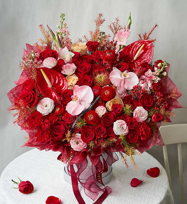 红玫瑰17枝,金红色针垫1枝(可以找接近代替),红色腊梅4枝多头,白色紫罗兰4枝,红掌2枝,白色蝴蝶兰2朵,金色千层金12枝,红色康乃馨9枝,白色桔梗(3头以上),红色多头玫瑰3枝(3头以上),红色洋牡丹5枝(可找接近代替),香槟玫瑰3枝,白色剑兰2枝【所有花材按图喷色】